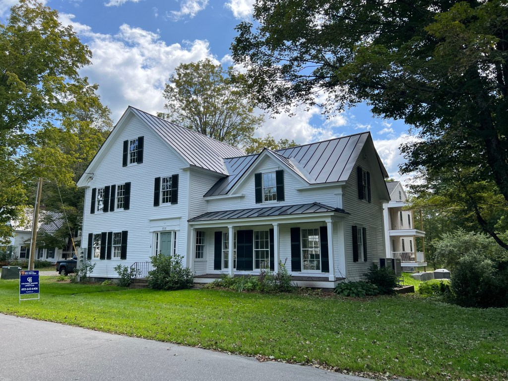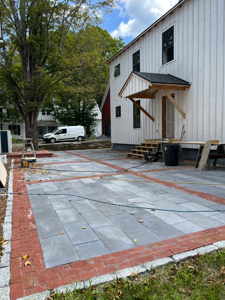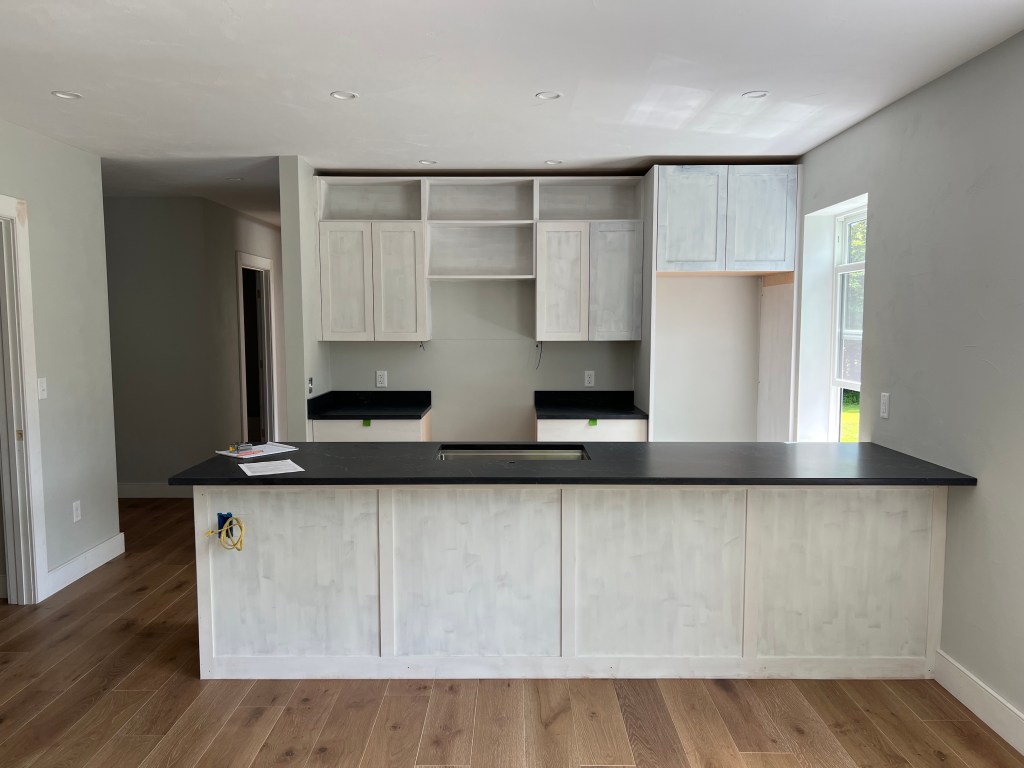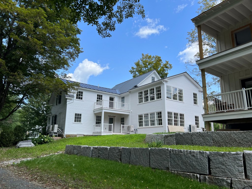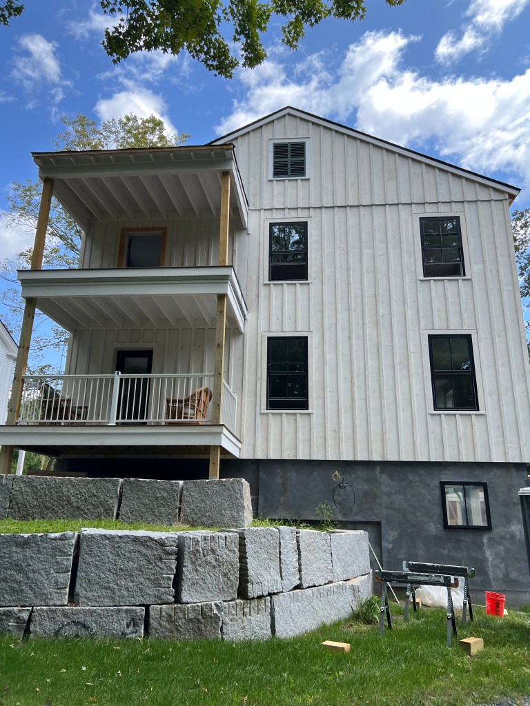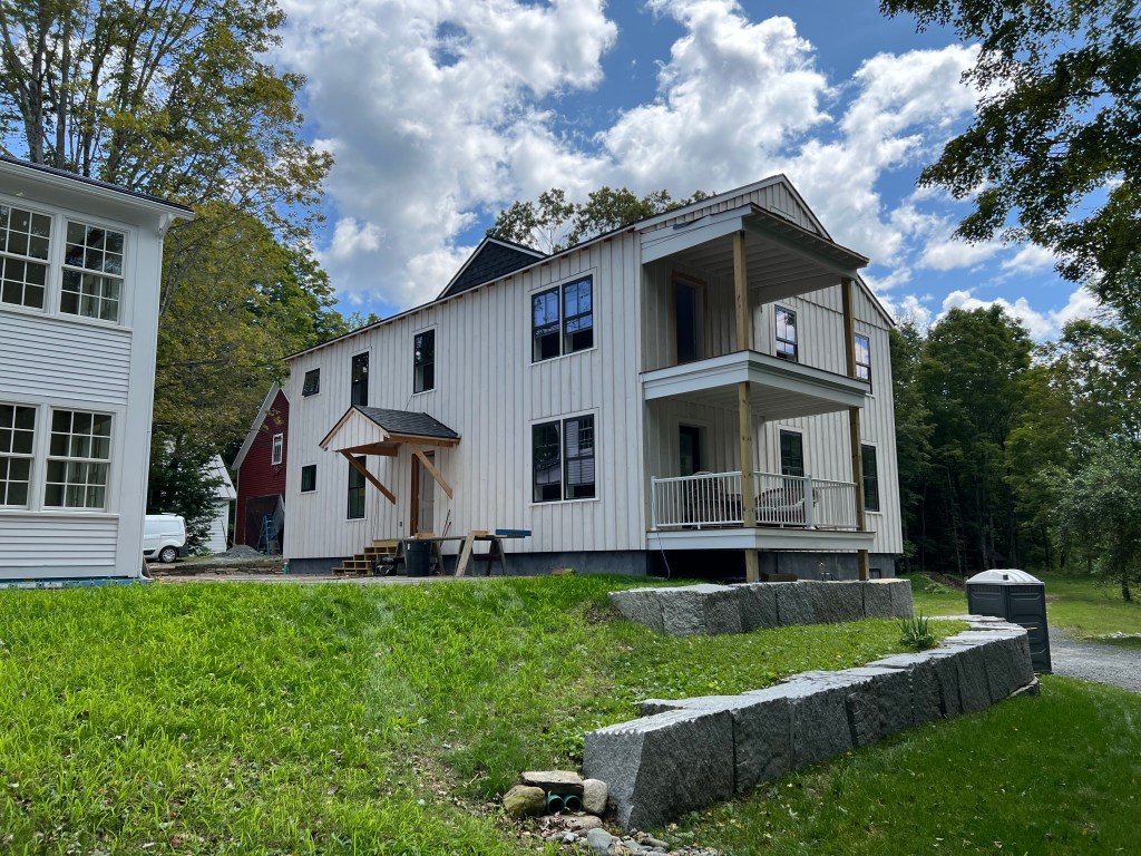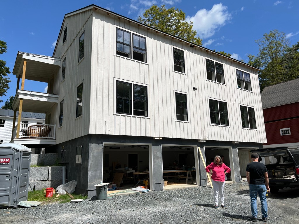 The living-dining room is spacious and bright. Those sheets of paper on the floor show the footprints of furniture we’re considering. We took many photos of the interior and exterior:The kitchen before cabinets received a final coat of paint and before appliances were installed.Our top-floor balcony is a great amenity.Another view of our building’s exterior.Sarah’s place occupies the entire second floor and a loft.The terrace will be a well-used amenity.Sarah’s condo looks over the village common.The four-car garage, with the builder’s agent and Brian in the foreground.