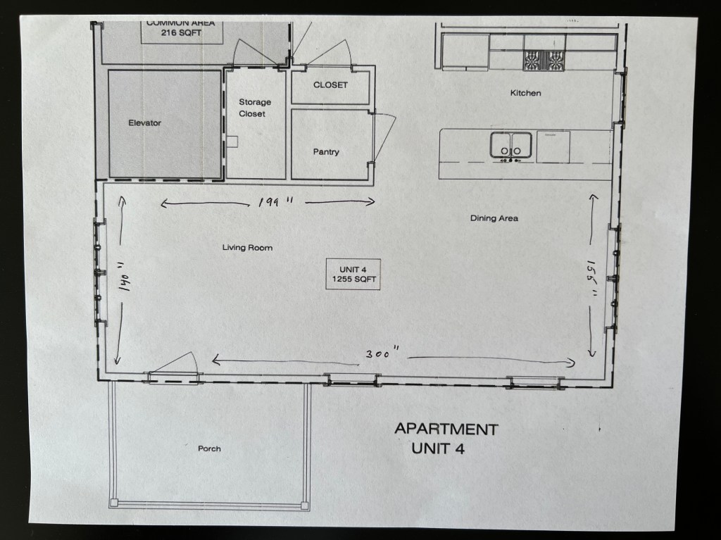 And the living-dining room, showing measurements we took for our Louisville interior designer Betsy Wall at Bittners.