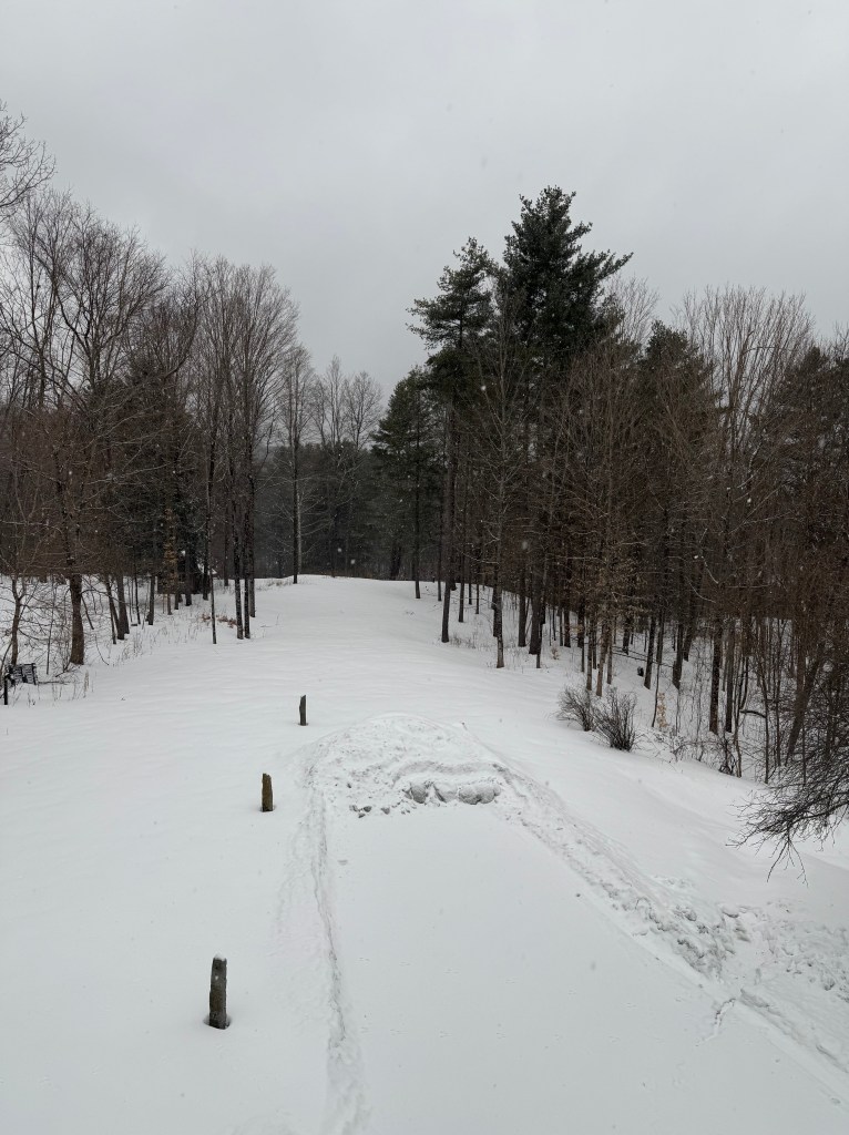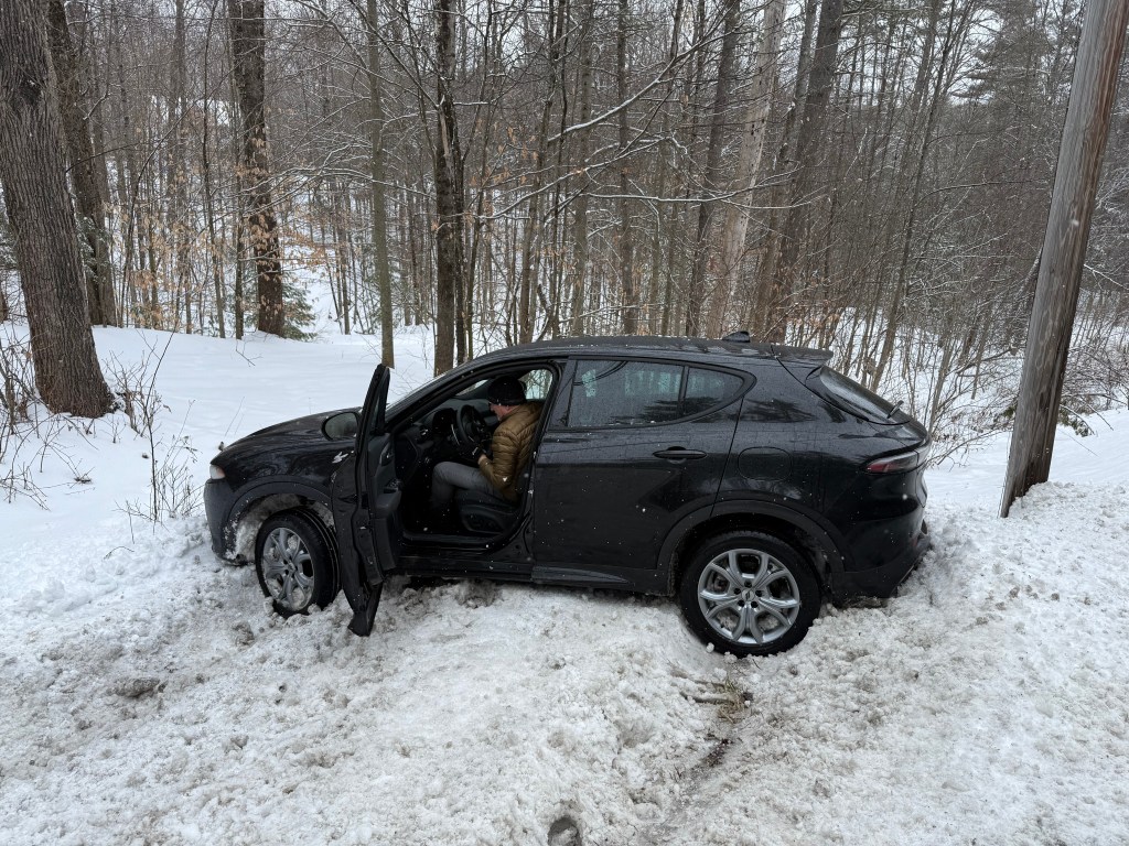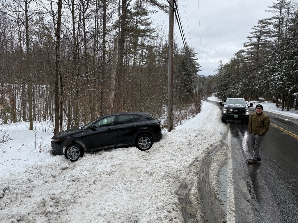 It was a rookie mistake. While driving down a hill on the Vermont side of the Thetford bridge, Jim braked at the wrong time, sending the car sliding into a snow bank. At first, Brian couldn’t open the passenger side door because it was stuck against a snow bank on the other side, so he climbed across the driver’s seat: